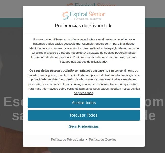 Quando o Utilizador visita o website pela primeira vez, ser-lhe-á apresentado um pop-up com uma explicação sobre os cookies, e ser-lhe-á solicitado o consentimento. O utilizador terá as opções de “Aceitar todos”, “Recusar Todos” ou “Gerir Preferências”.